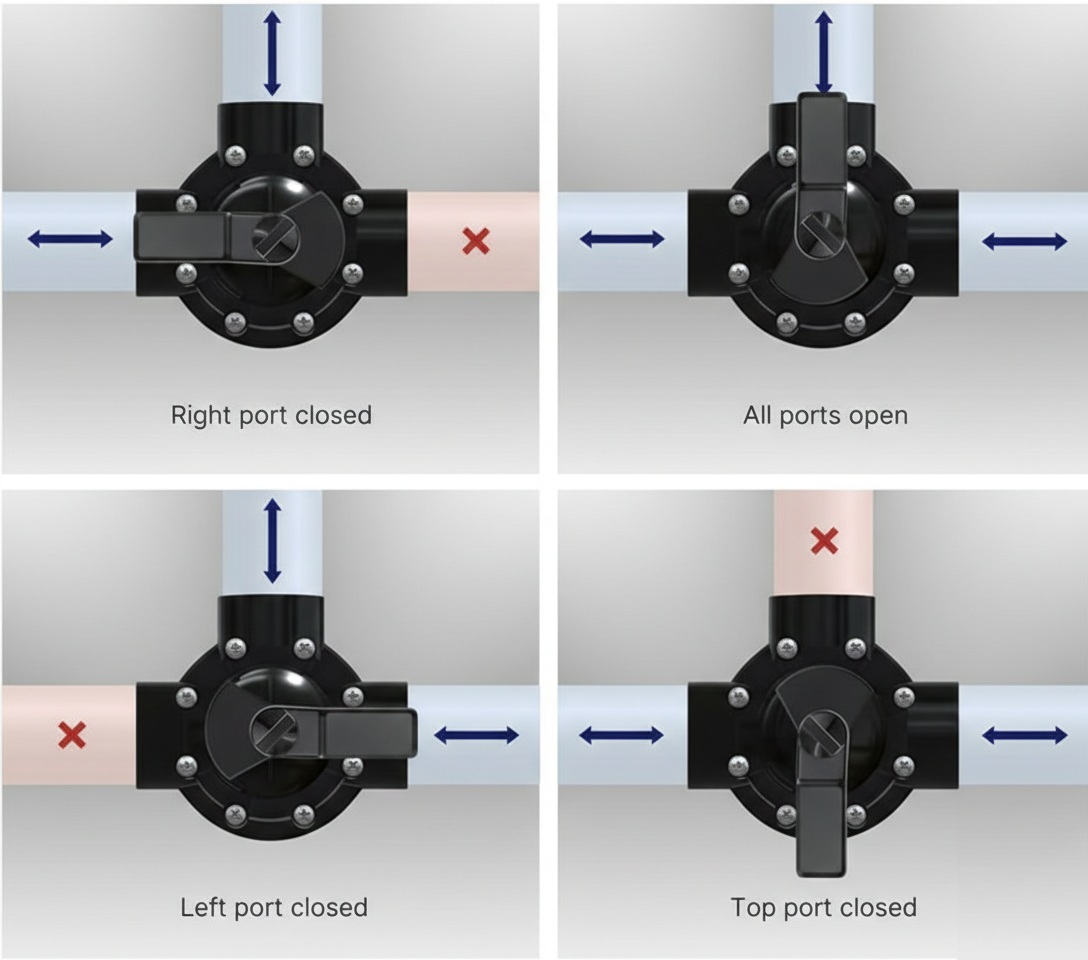 The diagram below reflects standard positioning for most valves; however, configurations may vary by manufacturer. Please verify the correct positioning for your specific valves.